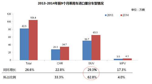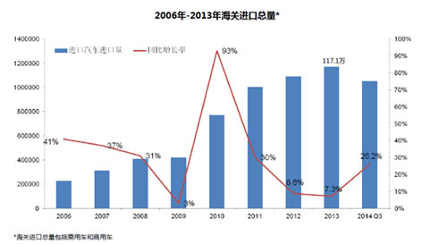 2014年前三季度,中國汽車累計進口量達到105.3萬輛,同比增速反彈到26.2%,月均進口量超過10萬輛,高供給局面再次形成。