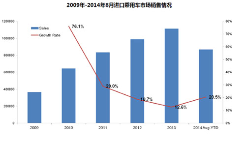 2014年1-8月,國內(nèi)進口車市場上牌86.6萬輛,同比增長20.5%,呈現(xiàn)短期性高增長。