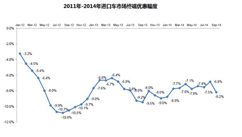 2014年9月份,汽車市場價格優(yōu)惠幅度達8.2%,高庫存壓力下,市場價格開始下行,是2014年除了一月份以外的單月最大優(yōu)惠幅度。