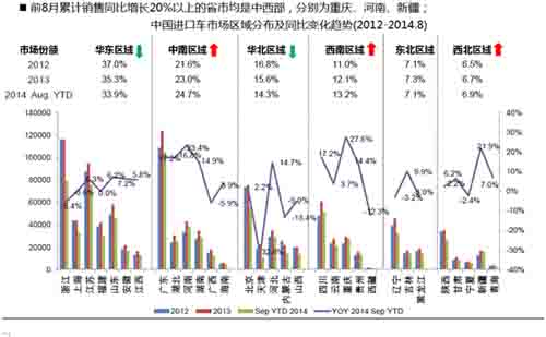 進口車市場快速向中南、西南和西北區(qū)域發(fā)展,傳統(tǒng)的東部和北部區(qū)域市場份額逐年下滑。