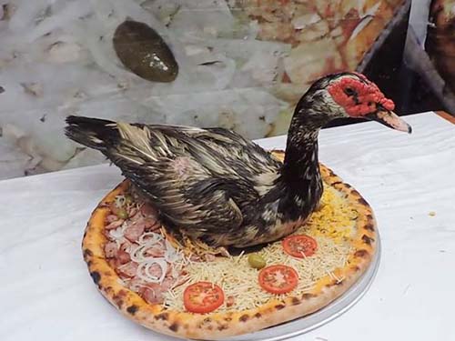 據(jù)了解,這家名為“閑聊”的比薩店,位于圣保羅州沿海小城瓜魯雅。該店在自己的臉書(shū)頁(yè)面上曬出大量奇葩搭配,各式傳統(tǒng)比薩的配餐中出現(xiàn)了汽車(chē)輪胎、整只烤雞、整箱啤酒,甚至一只活鴨子!