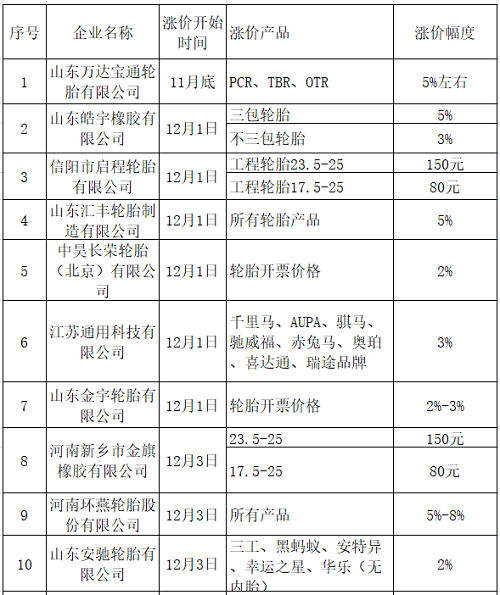 進(jìn)入12月,已經(jīng)有43家輪胎企業(yè)發(fā)布漲價(jià)通知。