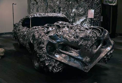 Florea采用3D打印技術(shù),將鉻合金依照他所設(shè)計(jì)的紋理圖案,堆砌在這輛福特Torino車身上。打印設(shè)備十分龐大,據(jù)說(shuō)是工業(yè)級(jí)別的3D打印機(jī)。為了打造出這個(gè)效果,這輛車已經(jīng)無(wú)法開(kāi)動(dòng)了。