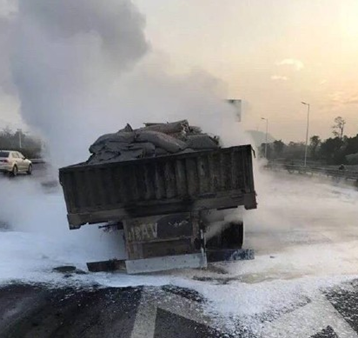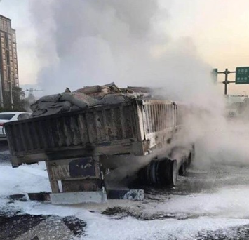 1月22日早晨6時49分,一輛運載水泥的大貨車輪胎發(fā)生自燃。