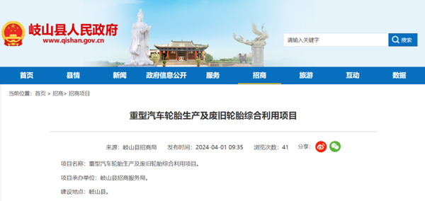 輪胎世界網(wǎng)了解到,2023年,漢泰威輪胎在岐山縣建設建設重型輪胎生產(chǎn)項目。